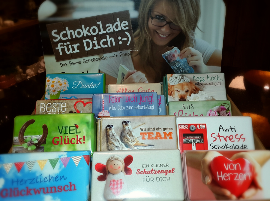Bei uns gibt es jetzt die feine 40g Schokolade mit einem netten Gruß. Damit können Sie nun Ihren Lieben oder Freunden den Tag versüßen. Schokolade kommt immer gut an!